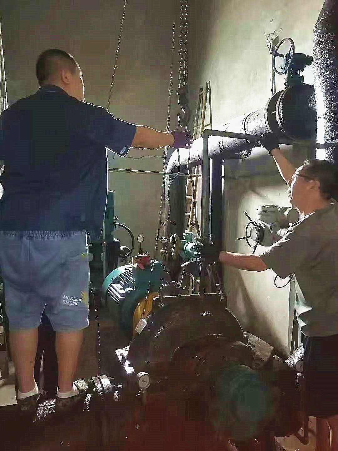 因三灣管道施工,從6月中旬開始庫區斷供,水廠全力抽取江水,水中雜物順流堵泵現象頻發。泵站值班人員隨時監測運行數據,及時拆卸泵殼清掏雜物以保證設備高效運行。其中愛河泵站5臺機組連續運行,堵泵情況最為嚴重。由于泵站屋頂低矮通風不暢,室內溫度超過五十攝氏度。為了維持取水效率,他們冒著中暑風險開泵搶修作業,充分展現了供水人愛崗敬業,服務社會的精神風貌。