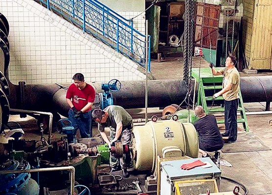 四道溝水源為保證水質,汛期前對反應池沉淀池進行清淤工作,對一級泵站設備進行維護保養大修。由于四道溝水源江心井吸水籠頭損壞,不能有效攔截江中雜物,致使一級泵站取水水泵經常堵塞,值班員和維修人員只能打開泵蓋進行人工清掏,最多時每天清掏3次。由于四道溝、SW新運轉泵站運轉車間內機組運行散發熱量,致使車間內溫度高于室外,最高時達到40度,值班員只能強忍高溫,對設備進行操作和維修。維修班更是頂著炎炎烈日完成日常維修,更換接梨樹泵站4號機組DN150出水水門、更換損壞的接觸器、檢修四道溝水源一泵站3號機組DN300出水水門。